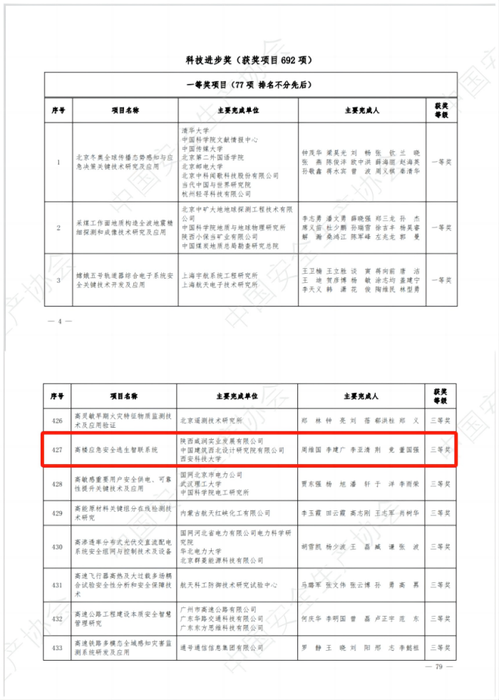 目前項目已累計申請國家專利51項(發(fā)明專利4項、實用新型專利34項、外觀設(shè)計專利13項)、計算機軟件著作權(quán)3項,先后入選陜西科技創(chuàng)新優(yōu)秀案例(列入優(yōu)秀案例合集)、西咸新區(qū)科技計劃社會發(fā)展類項目,連續(xù)2年被納入西安市應(yīng)急管理科技創(chuàng)新重點工作任務(wù),以該項目為基礎(chǔ)的2項地方標準《高層建筑緊急逃生設(shè)施應(yīng)用技術(shù)規(guī)程》和《高層建筑緊急逃生固定設(shè)施構(gòu)造圖集》在陜西省住房和城鄉(xiāng)建設(shè)廳完成立項審批。經(jīng)陜西省科學技術(shù)廳組織技術(shù)鑒定,成果評價為“國際領(lǐng)先”水平、填補行業(yè)空白。