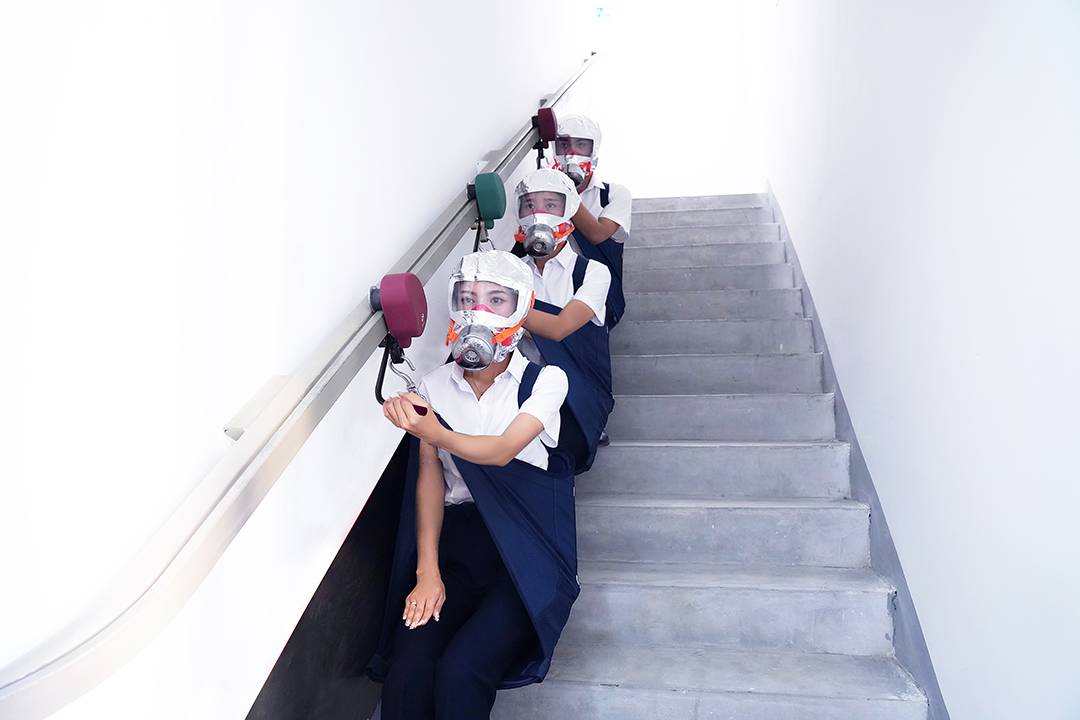 安全座椅內(nèi)置電子定位芯片,與樓梯通道內(nèi)安裝的專(zhuān)用設(shè)備實(shí)現(xiàn)逃生過(guò)程中的位置追蹤,座椅采用B1級(jí)防火材料,背部?jī)?nèi)嵌反光箔膜,便于識(shí)別濃煙中的逃生者。