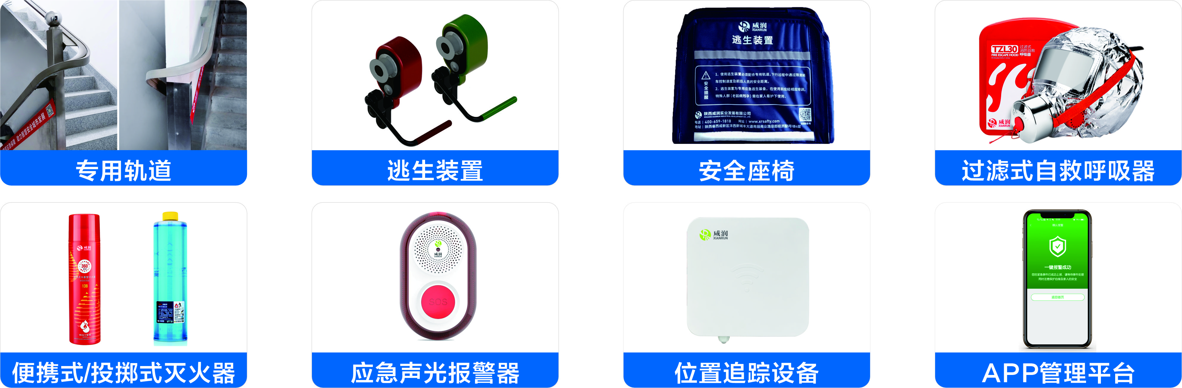 ·逃生設(shè)施的核心產(chǎn)品由專(zhuān)用軌道、逃生裝置、過(guò)濾式自救呼吸器組成。